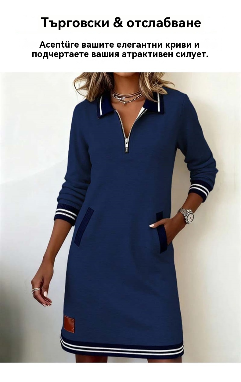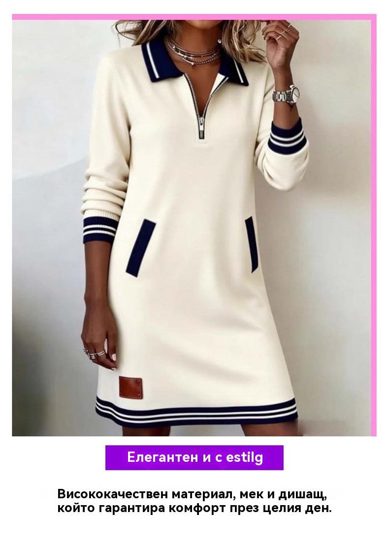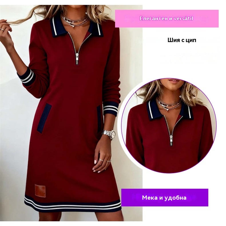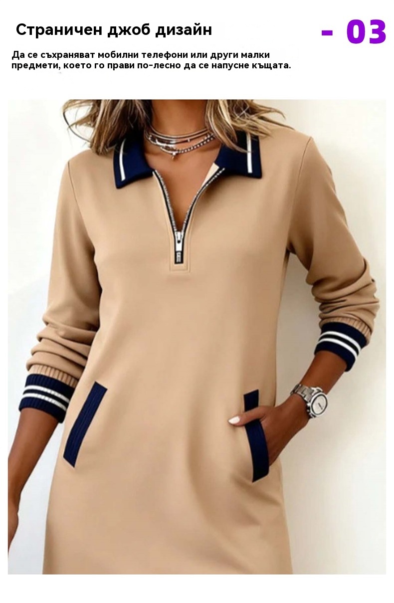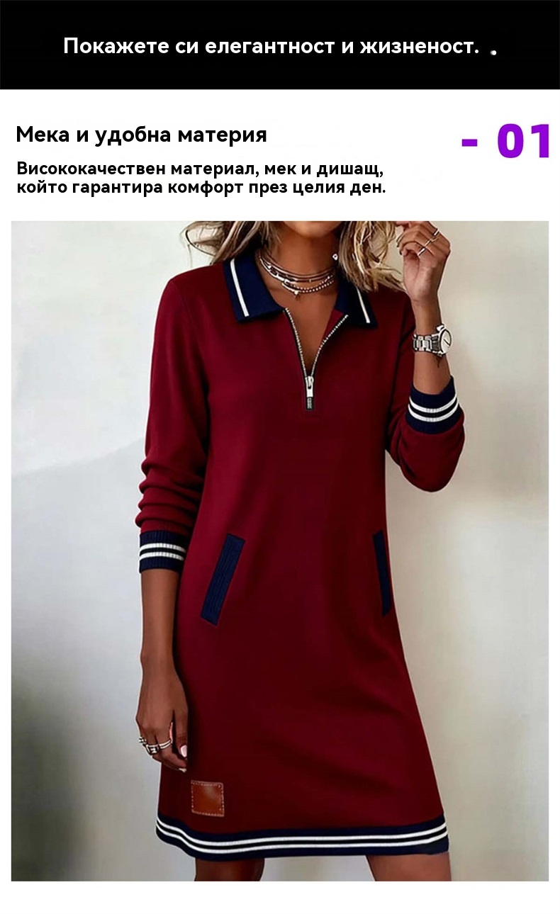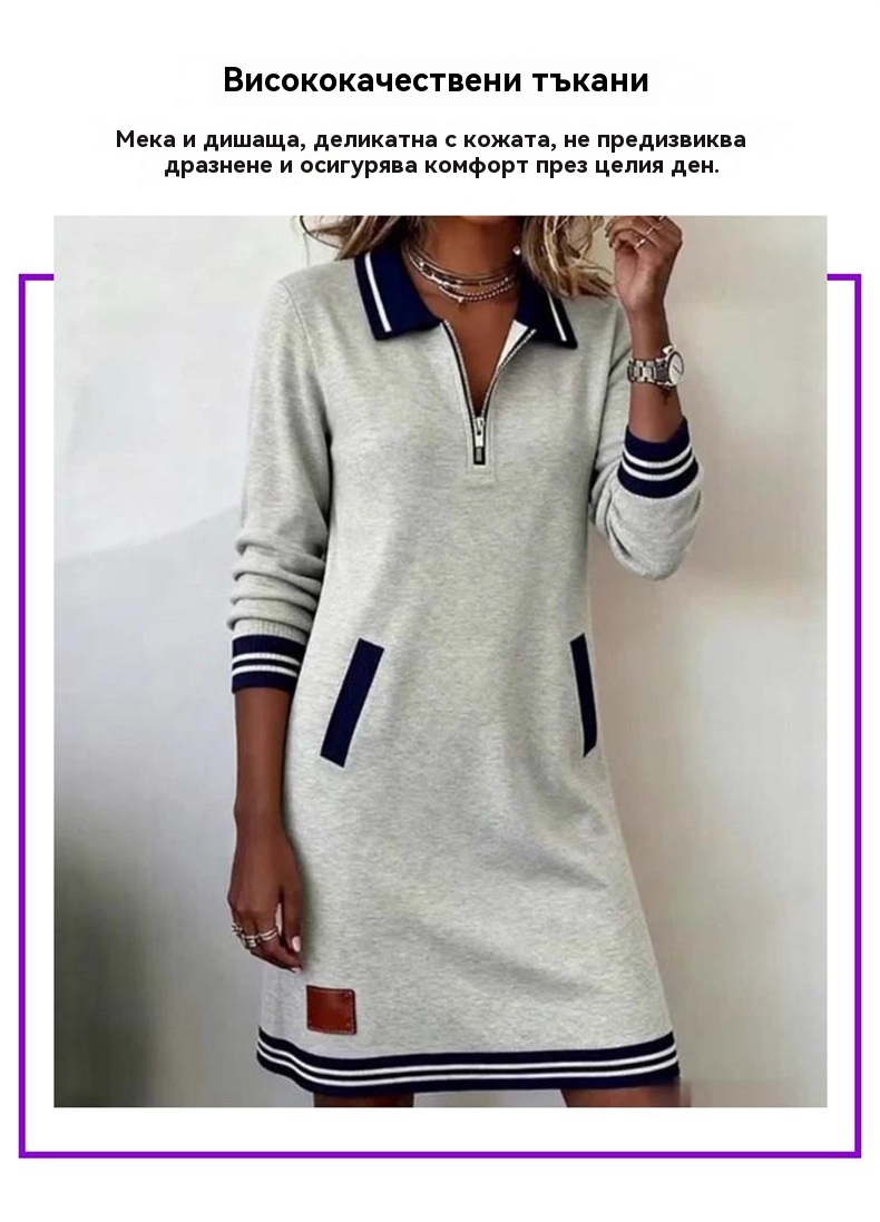 🔥🔥【40-100kg】Нова зимна ежедневна рокля с цип, яка, дълъг ръкав и джоб в цветни блокове