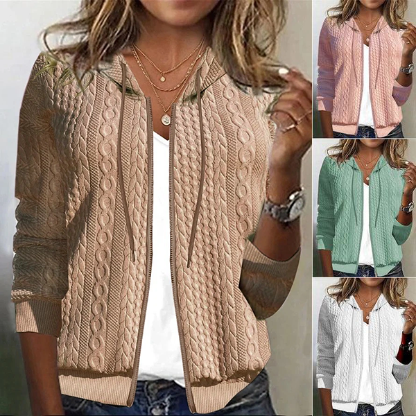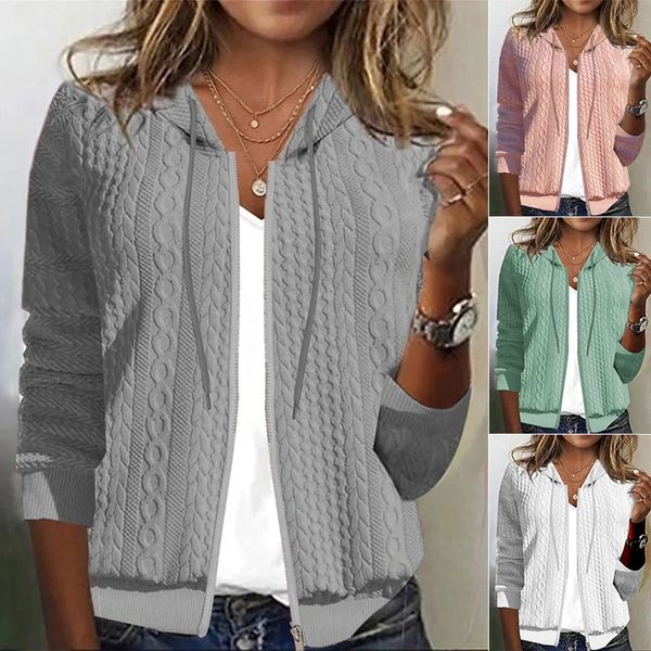 ✨✨Szezonális akció -42%✨ Női kapucnis cipzáras kardigán, egyszínű horgolt hosszú ujjú pulóver