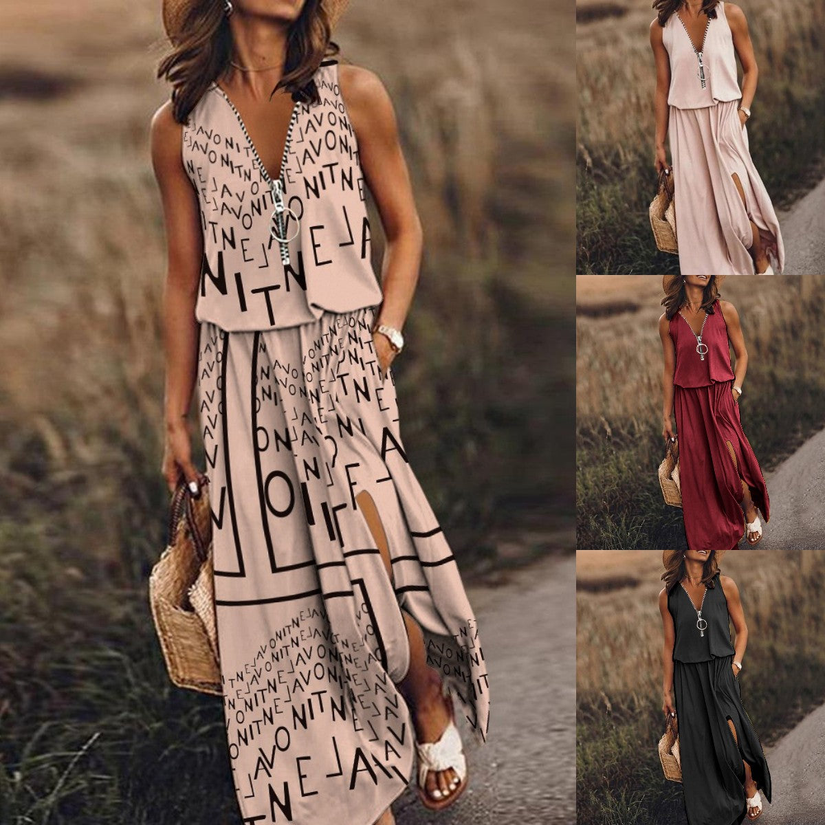 🎁💃【Sleva 50 % 💥】【S–5XL】Nové dlouhé ležérní šaty bez rukávů s potiskem, přiléhavým střihem a zipem, pro plnoštíhlé ženy